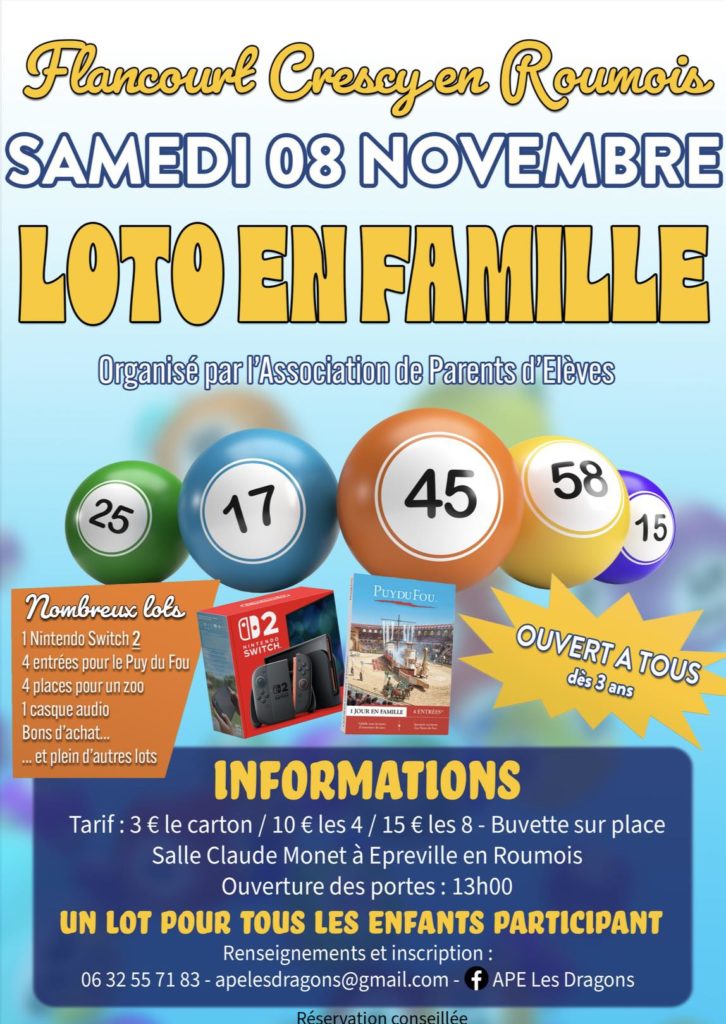 L’association des Parents d’Elève « les Dragons » organise un loto familial le samedi 8 novembre à la salle CLAUDE MONET.