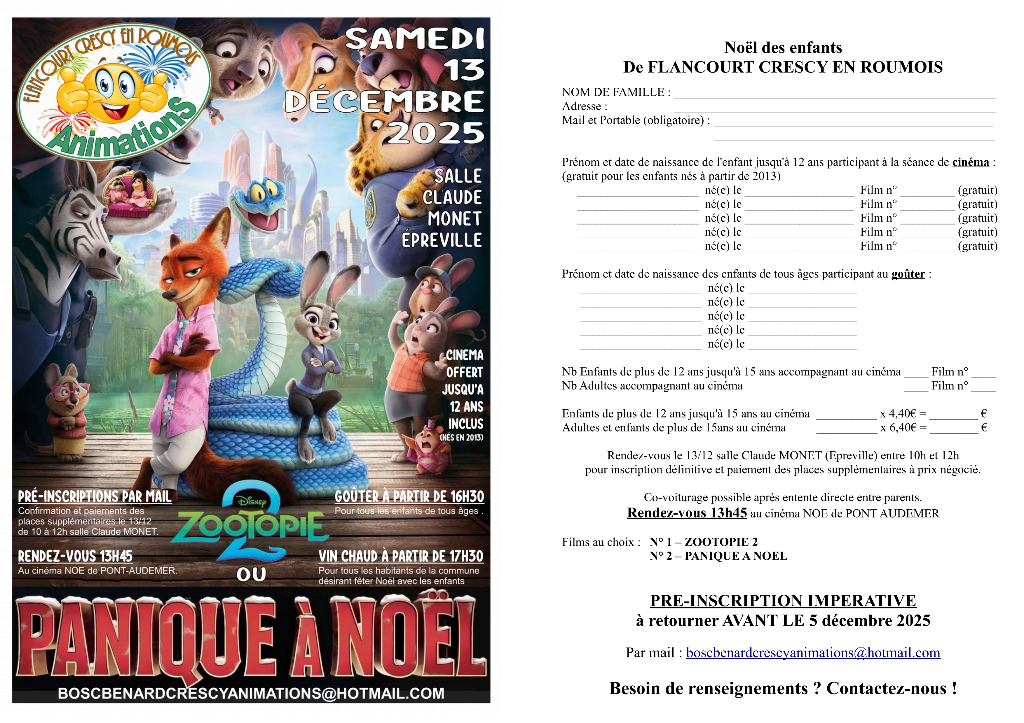2 – Dès que possible et avant le 5 décembre, s’inscrire par mail à boscbenardcrescyanimations@hotmail.com à l’aide du coupon joint ou en envoyant simplement les informations demandées par mail.